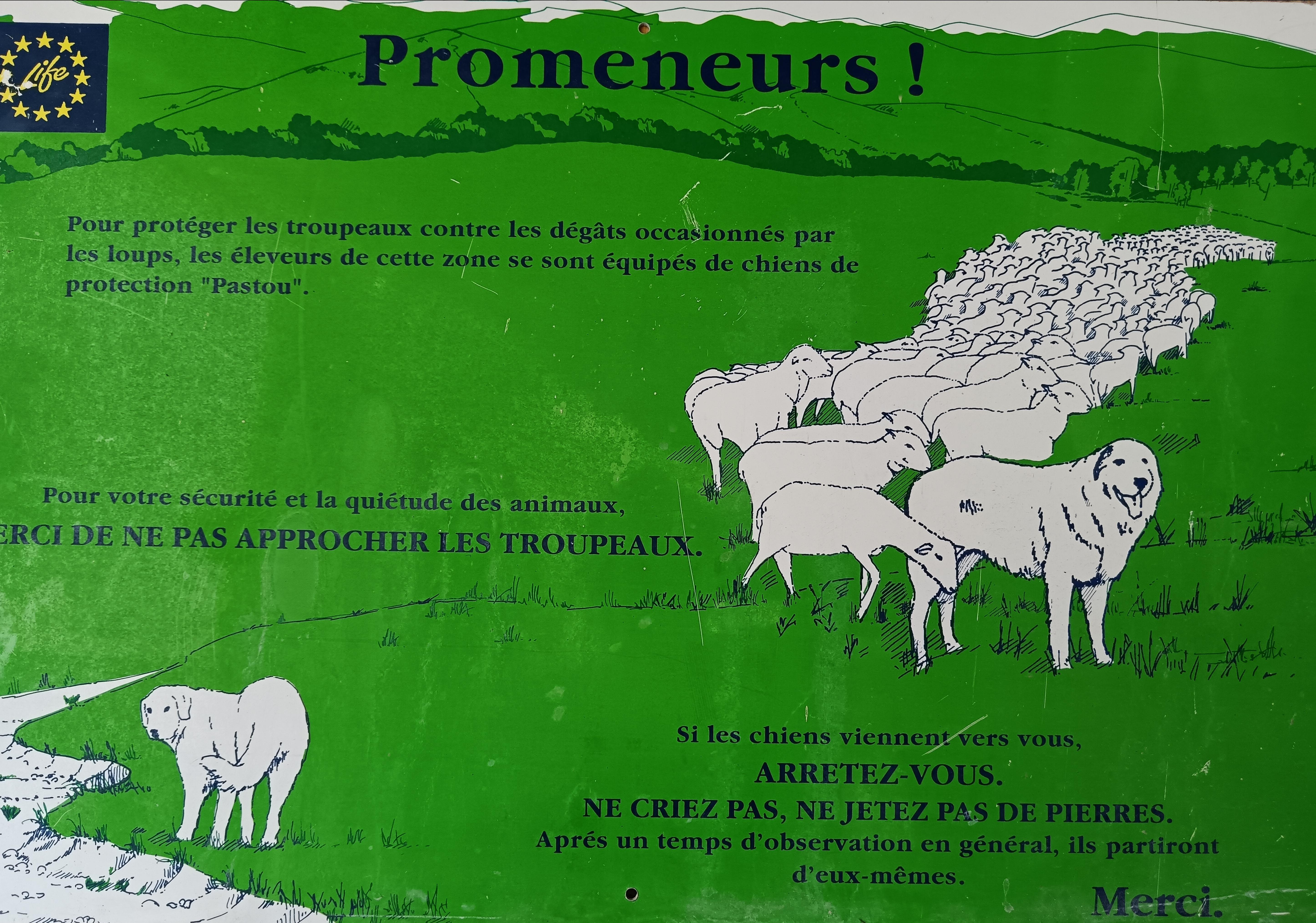 POUR VOTRE PROTECTION & QUIETUDE DU TROUPEAU : MERCI DE NE PAS APPROCHER LES TROUPEAUX Les chiens de protection protègent tout autour de la zone de paturage du troupeau, et potentiel risque avec le troupeau lui même (si mère & petits )